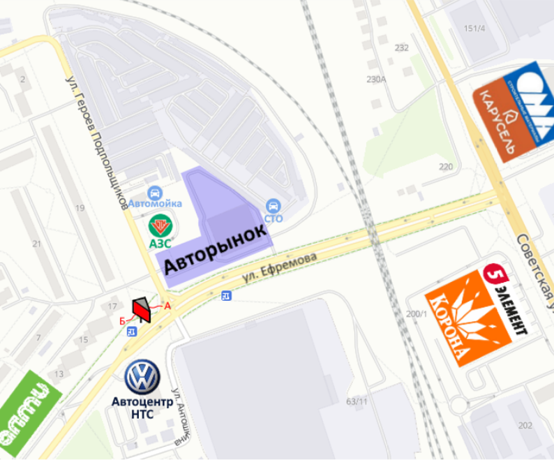 Рядом находится: перекресток, светофор, пешеходный переход, остановка общественного транспорта, парковка, самый крупный в Гомеле авторынок «Ефремовский», автоцентр НТС «Volkswagen», АЗС «Белоруснефть», Авторазборки, Автомойка, большое количество «СТО», супермаркет «АЛМИ», супермаркет «Корона», магазин бытовой техники «5 элемент», магазин «ЕВРООПТ», строительный ТЦ «Карусель» и «Ома».