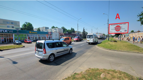Щит расположен на Речицком проспекте, перед ТРЦ «Мандарин Плаза», ост. «Проспект Речицкий». Очень оживленное автомобильное и пешеходное движение. Напротив находится Салон плитки «Альтагамма», Fix Price, Доброном, торговый центр Олимп. Сторона А работает при движении в сторону ТРЦ «Мандарин Плаза».